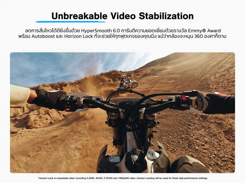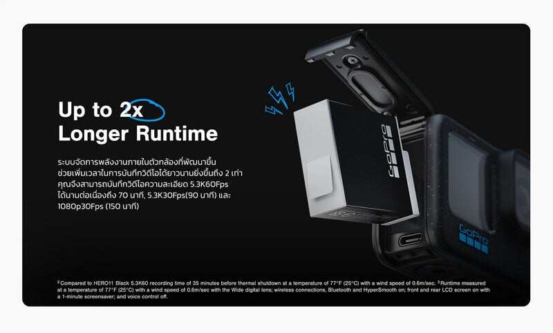 The All-New GoPro กล้องแอคชั่นแคม GoPro Hero 12 ให้คุณใช้งานได้นานขึ้น 2 เท่า สามารถถ่ายวิดีโอความละเอียดสูงสุด 5.3K/60 พร้อม HyperSmooth 6.0 และคุณสมบัติในการถ่ายภาพ-วิดีโอแบบ HDR อีกทั้งรองรับการใช้งานกับหูฟังไร้สายผ่าน Bluetooth อีกด้วย